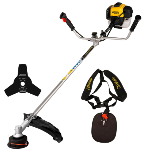 La máquina viene equipada con todo lo necesario para empezar de inmediato: disco de tres puntas, cabezal de nylon y arnés, ofreciendo un equipo completo y práctico para cualquier usuario.