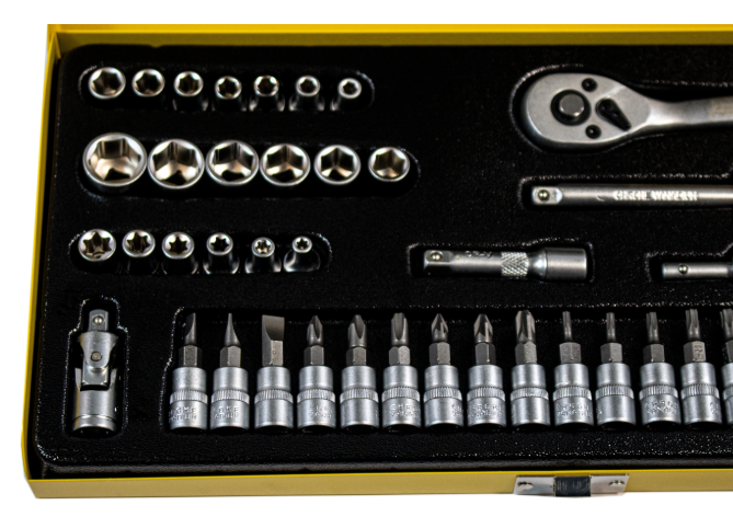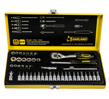 Estuche metálico con juego de carraca pequeña completo. Incluye mango atornillador para bocas de 1/4", prolongadores y bocas de los tipos TORX, E, PHILIPS, PLANA, ESTRELLA PZ, ALLEN y HEXAGONAL.